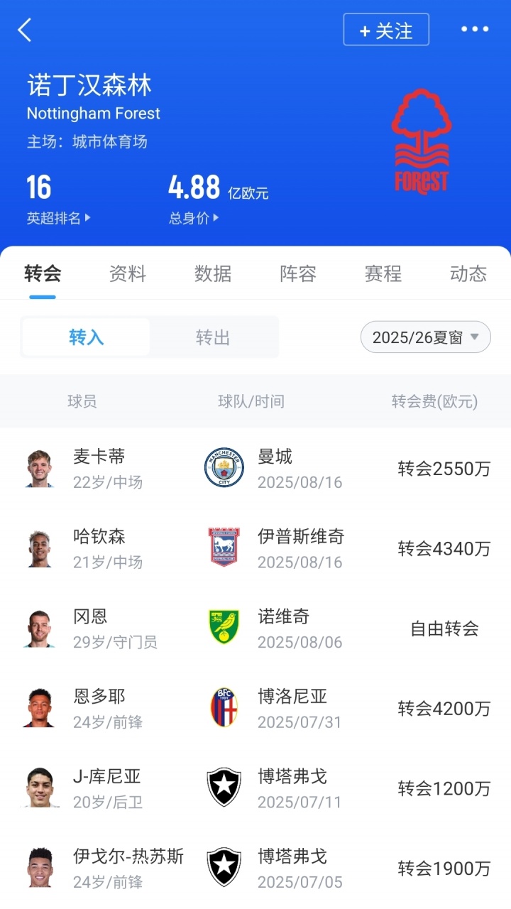 诺丁汉森林今夏引援(总计1.734亿欧)↓