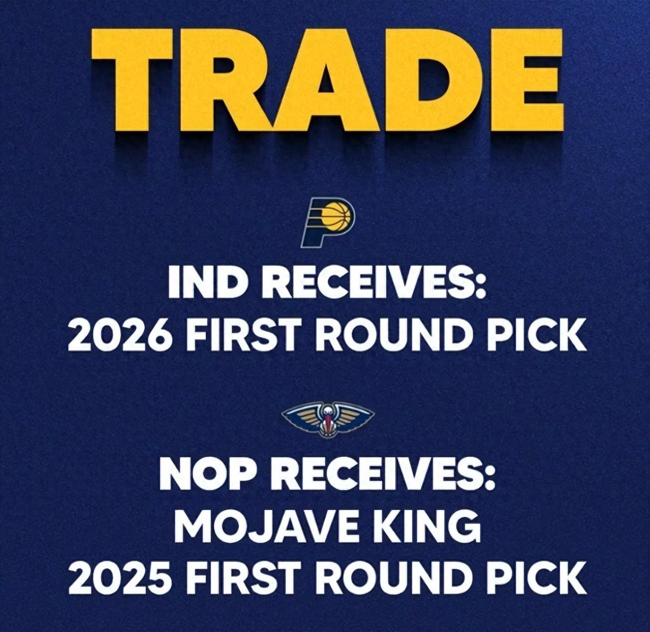 “步行者将今年的首轮23号签,以及2023年47号秀莫哈维-金的签约权打包,送至鹈鹕,换回一枚2026年首轮选秀权。”