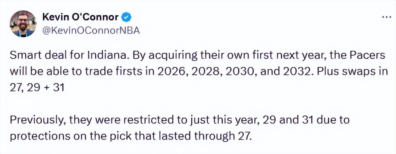 “这笔交易帮助步行者重新掌握了2026-2032年这七年间的所有首轮签控制权,其中包括2026、2028、2030、2032年的首轮签,以及2027、2029和2031年的首轮互换权。提升了球队未来交易谈判的灵活性,同时也为重磅补强或者未来选秀埋下伏笔。”